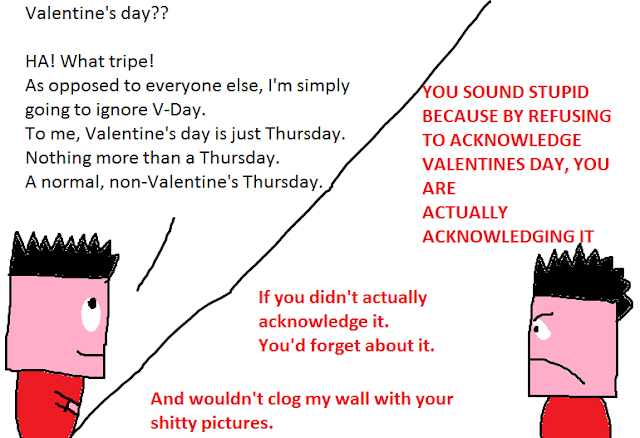 If you don't want to acknowledge Valentines day, then tell every fucking person your plans to ignore it. Like I said before, this is what we call a contradiction.